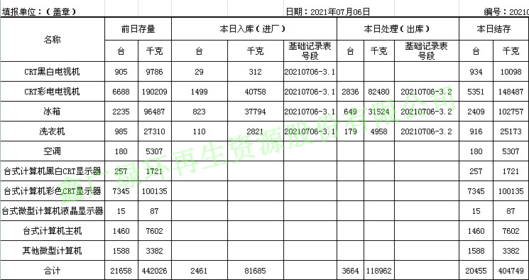 2021.07.06回收拆解統(tǒng)計表