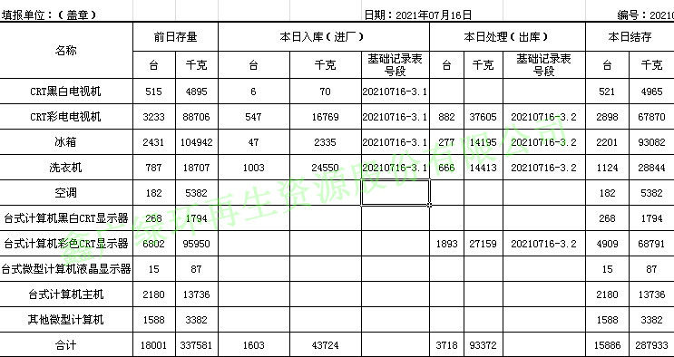 2021.07.16回收拆解統(tǒng)計(jì)表