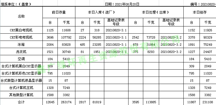 2021.08.21回收拆解統(tǒng)計(jì)表