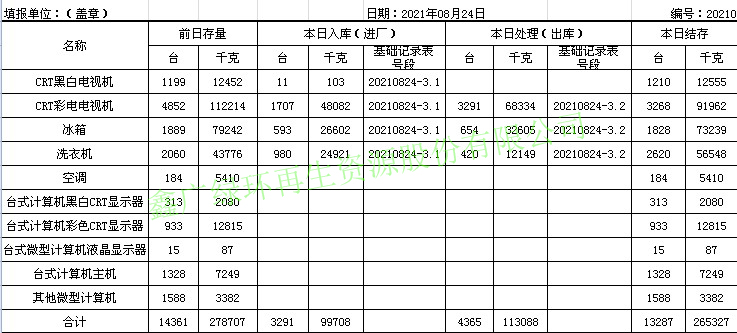 2021.08.24回收拆解統(tǒng)計(jì)表