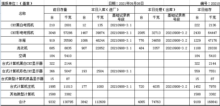 2021.09.07回收拆解統(tǒng)計表