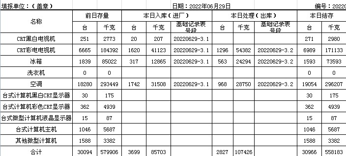 2022.06.29回收拆解統(tǒng)計(jì)表