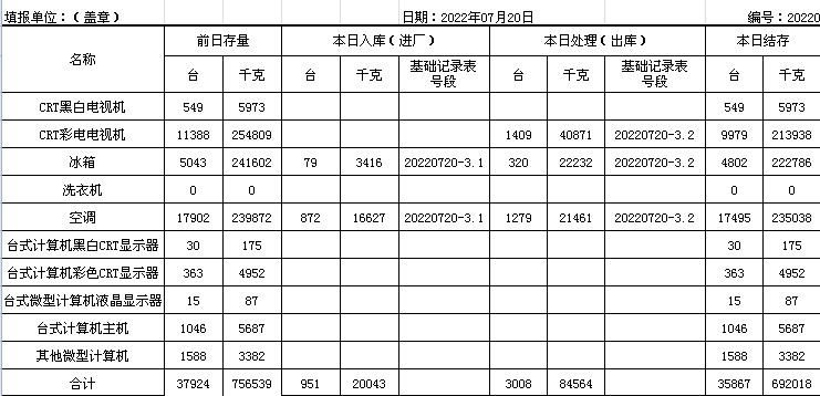 2022.07.20回收拆解統(tǒng)計(jì)表