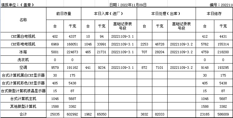 2022.11.09回收拆解統(tǒng)計(jì)表