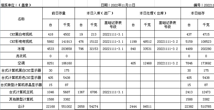 2022.11.11回收拆解統(tǒng)計(jì)表