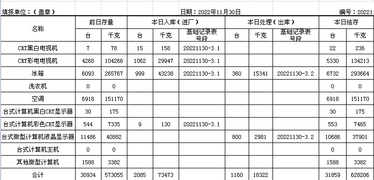 2022.11.30回收拆解統(tǒng)計(jì)表