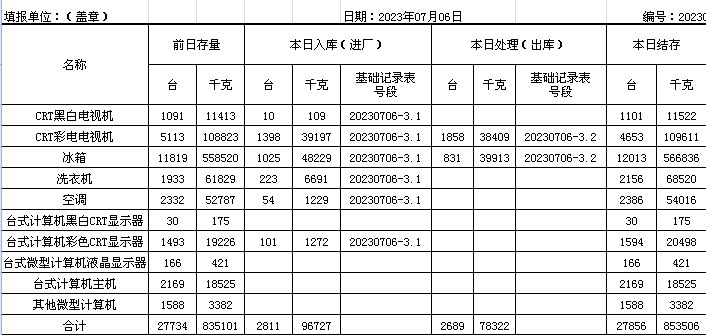 2023.07.06回收拆解統(tǒng)計(jì)表