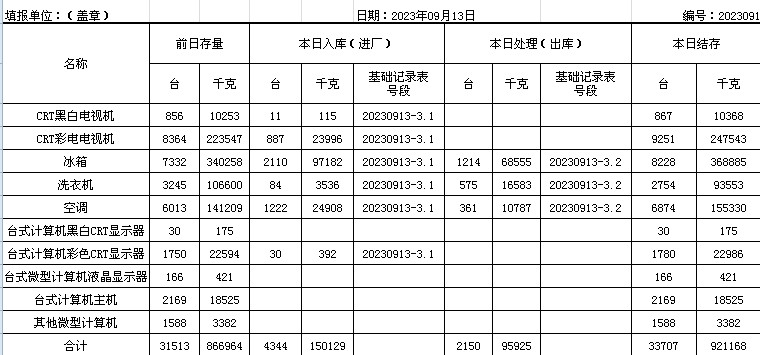 2023.09.13回收拆解統(tǒng)計(jì)表