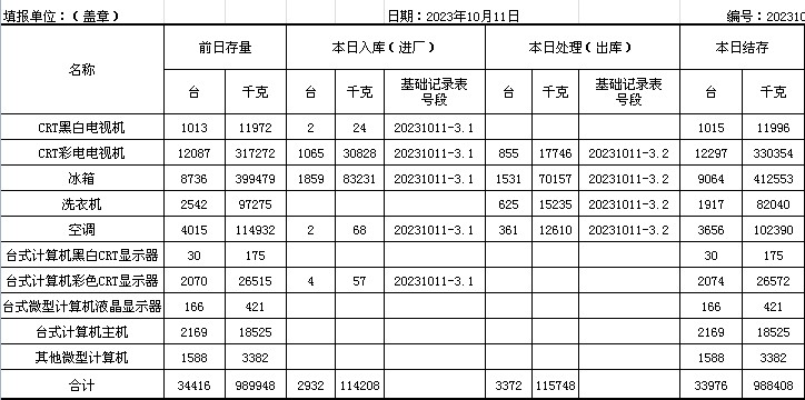 2023.10.11回收拆解統(tǒng)計(jì)表