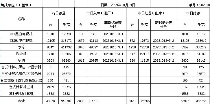 2023.10.13回收拆解統(tǒng)計(jì)表
