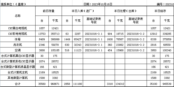 2023.10.16回收拆解統(tǒng)計(jì)表