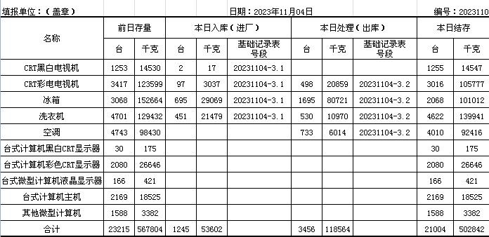 2023.11.04回收拆解統(tǒng)計(jì)表