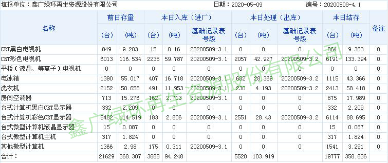 2020.05.09回收拆解統(tǒng)計表