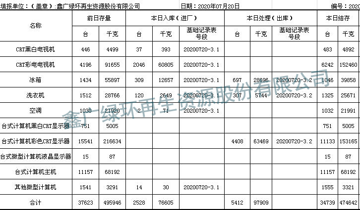 2020.07.19回收拆解統(tǒng)計(jì)表