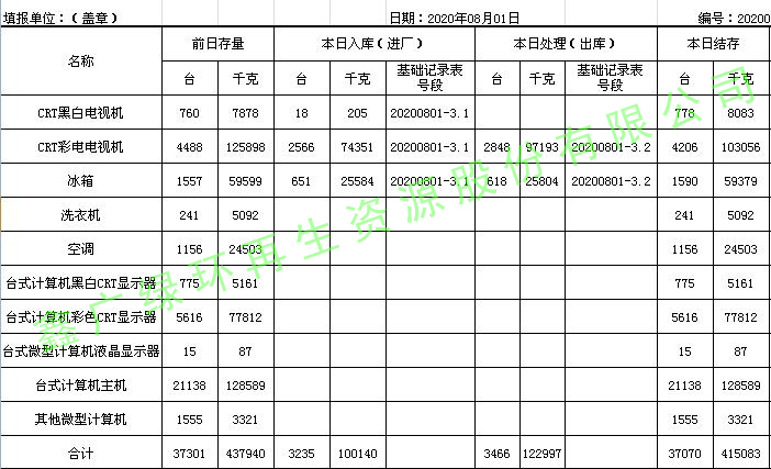 2020.08.01回收拆解統(tǒng)計(jì)表