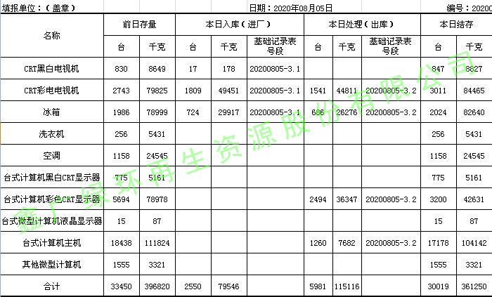 2020.08.05回收拆解統(tǒng)計表