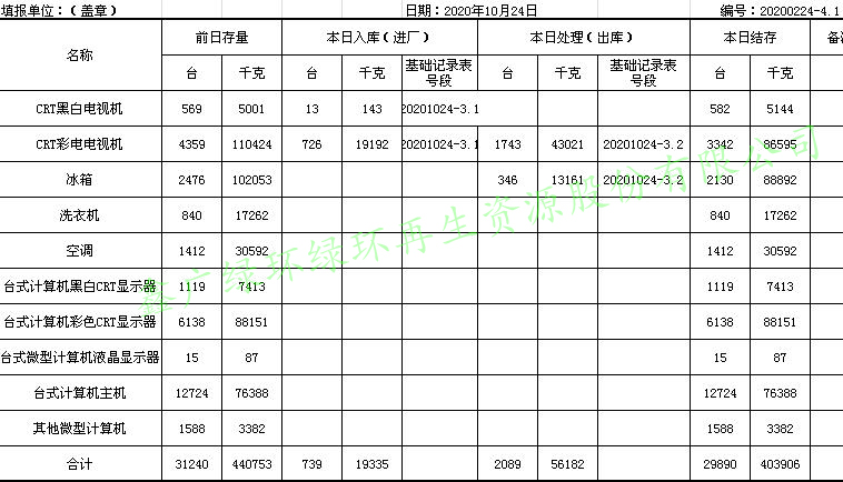 2020.10.24回收拆解統(tǒng)計(jì)表