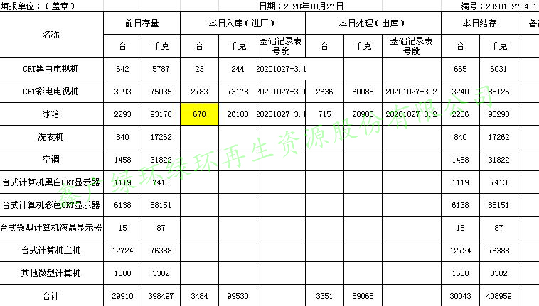 2020.10.27回收拆解統(tǒng)計(jì)表