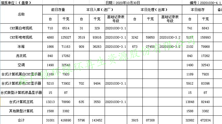 2020.10.31回收拆解統(tǒng)計表