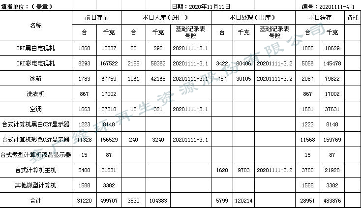 2020.11.11回收拆解統(tǒng)計(jì)表