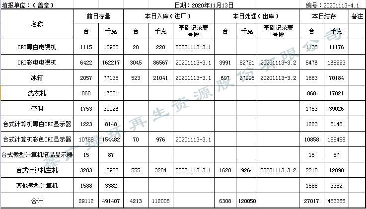 2020.11.13回收拆解統(tǒng)計(jì)表
