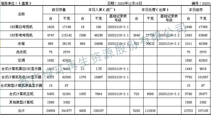2020.12.18回收拆解統(tǒng)計(jì)表