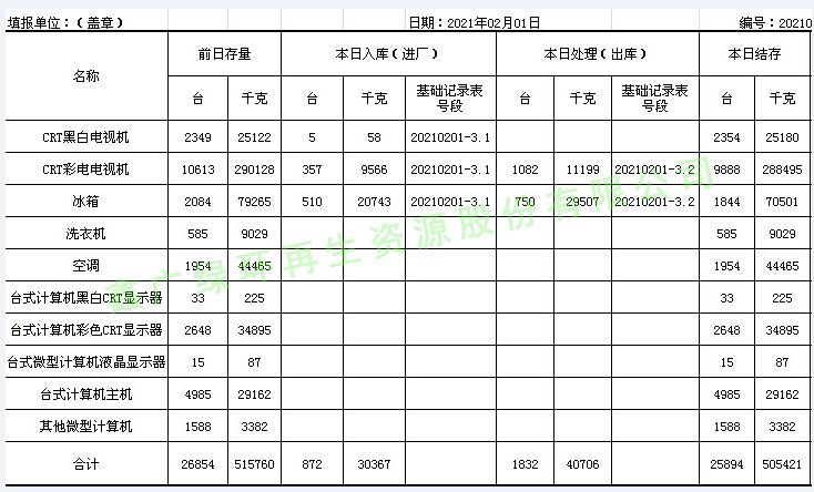 2021.02.01回收拆解統(tǒng)計(jì)表