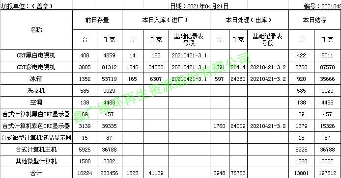 2021.04.21回收拆解統(tǒng)計(jì)表