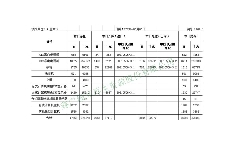 2021.05.06回收拆解統(tǒng)計(jì)表