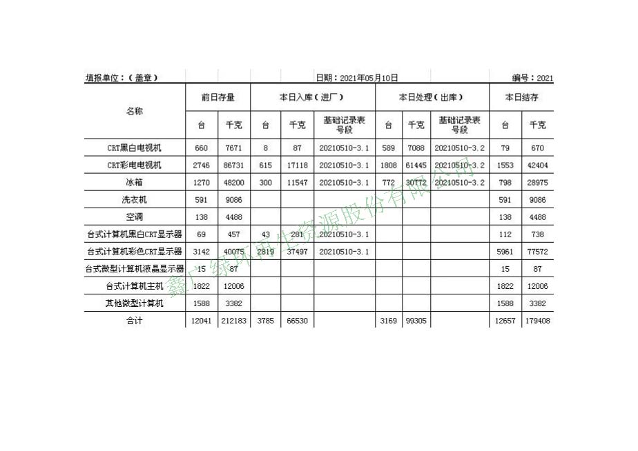 2021.05.10回收拆解統(tǒng)計(jì)表