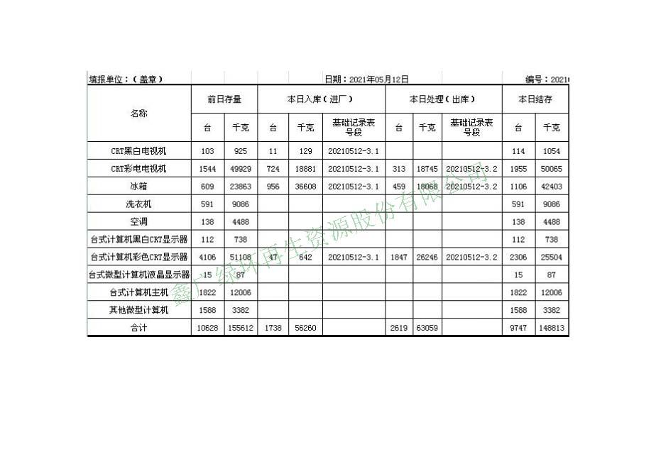 2021.05.12回收拆解統(tǒng)計表