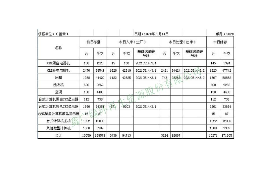 2021.05.14回收拆解統(tǒng)計(jì)表
