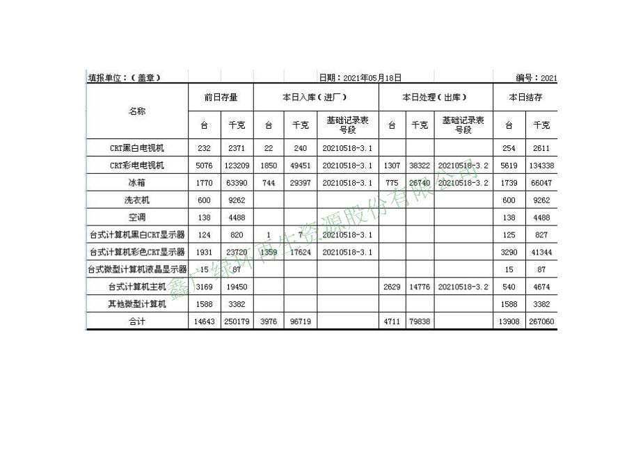 2021.05.18回收拆解統(tǒng)計(jì)表
