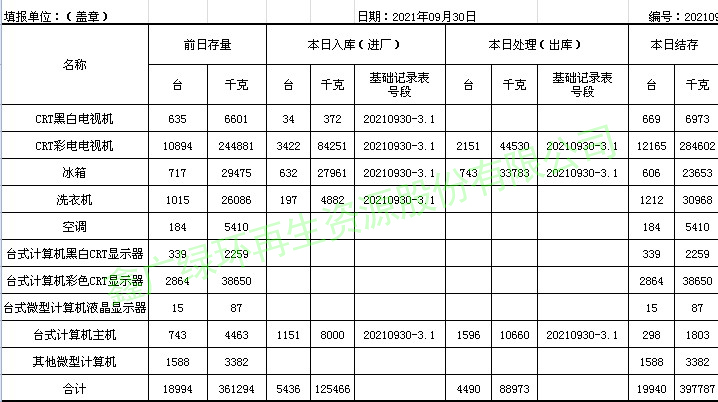 2021.09.30回收拆解統(tǒng)計(jì)表