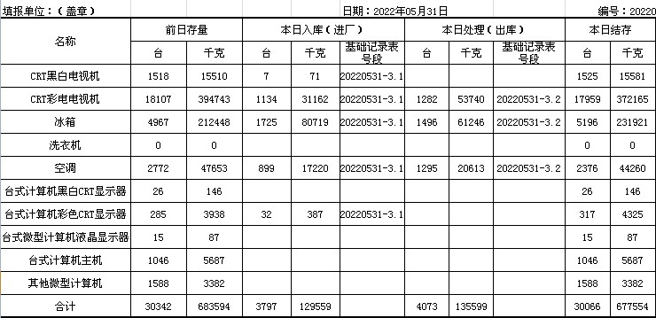 2022.05.31回收拆解統(tǒng)計(jì)表
