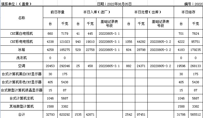 2022.08.05回收拆解統(tǒng)計(jì)表