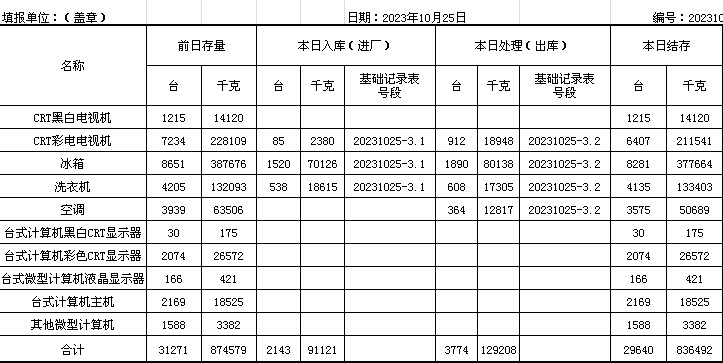 2023.10.25回收拆解統(tǒng)計(jì)表