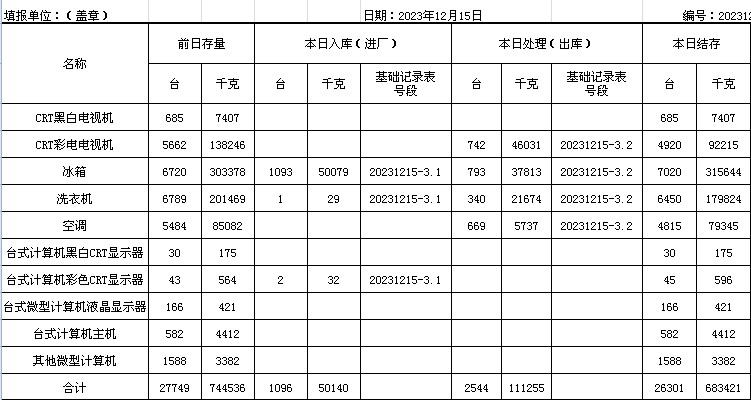 2023.12.15回收拆解統(tǒng)計(jì)表