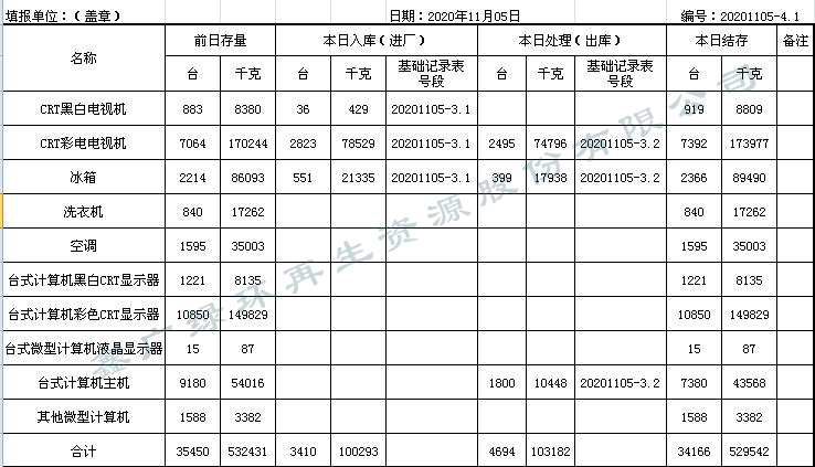 2020.11.4回收拆解統(tǒng)計表