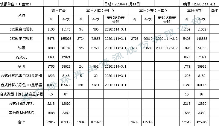 2020.11.14回收拆解統(tǒng)計(jì)表