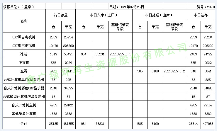 2021.02.25回收拆解統(tǒng)計(jì)表