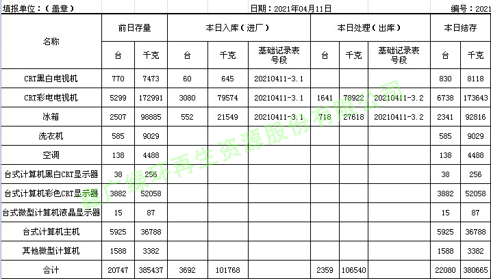 2021.04.11回收拆解統(tǒng)計(jì)表