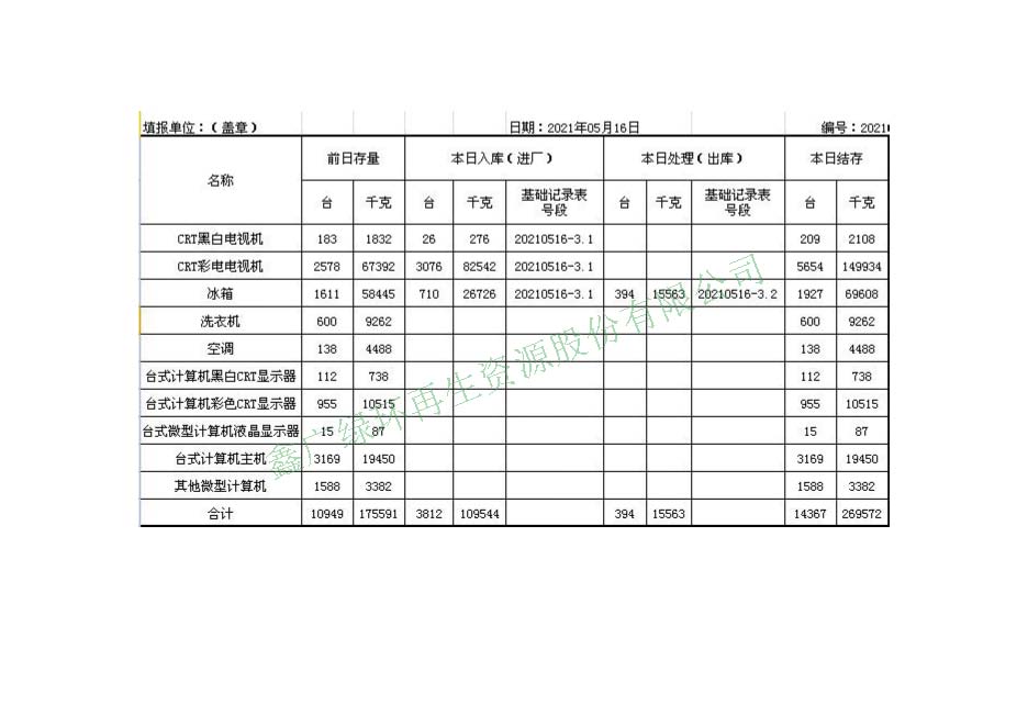 2021.05.16回收拆解統(tǒng)計表